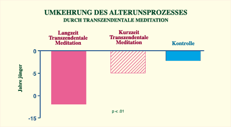 Personen, die Transzendentale Meditation länger als fünf Jahre ausübten, zeigten ein biologisches Alter 12 Jahre jünger als ihr tatsächliches Alter – ein signifikanter Unterschied zu Kurzzeit- Meditierenden und Nicht-Meditierenden Kontrollgruppen. Diese Ergebnisse deuten auf eine Entwicklung der Gesundheit hin und auf die Förderung der Langlebigkeit durch Maharishis Programm der Transzendentalen Meditation.