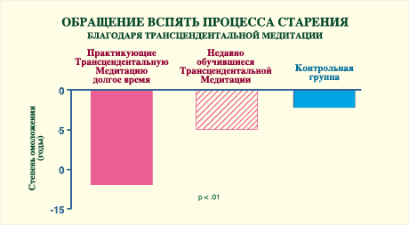 Исследуя это омолаживающее влияние, учëные, изучающие процесс старения, обнаружили, что у людей, практикующих Трансцендентальную Медитацию в течение пяти и более лет, биологический возраст на двенадцать лет ниже нормы. |