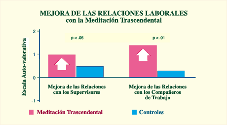 Ejecutivos y empleados de dos empresas donde se introdujo el programa de la Meditación Trascendental que practicaron regularmente la Meditación Transcendental durante dos meses mostraron aumento significativo en eficiencia y productividad, satisfacción laboral y en las relaciones personales, en comparación a miembros de un grupo control con puestos similares en esas dos empresas. Referencia: Academy of Management Journal 17 (1974): 362–368. |
